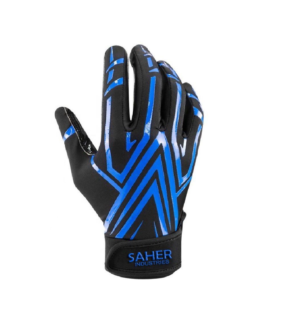 These Football Receiver Gloves are crafted with high quality Spandex, Microfiber Leather, Neoprene and feature a Full Palm Silicone Grip that provides exceptional control during gameplay. The lightweight and stretchable construction offers a maximum range of motion while the highly breathable material ensures all day comfort. The gloves are designed with durability in mind, making them suitable for both practice and sporting events. The enhanced grip surface improves ball handling and catching ability while the flexible fit allows quick and efficient hand movements for peak performance. Available in sizes for kids, youth, and adults, these gloves are versatile and designed to fit all players. Logo printing options include Silicone, Dye Sublimation, Embroidery, Silk Screen, Reflective, and Heat Transfer, giving you the freedom to customize and represent your team or brand with style.